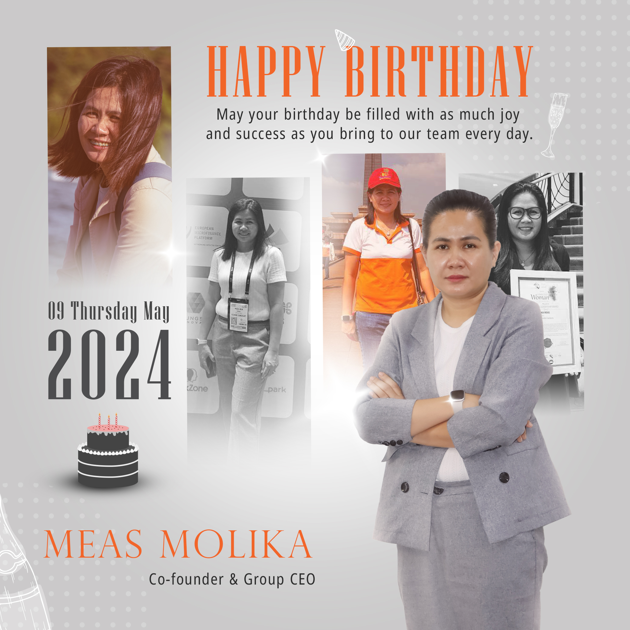 Wishing Messages to Governor & CEO of iCare Leasing Plc 9 May 2024 Happy Birthday to Mrs. Meas Molika , Co-Fonder & Group CEO , 09 Thursday 2024 May your birthday be filled with as much joy and success as you bring to our team everyday