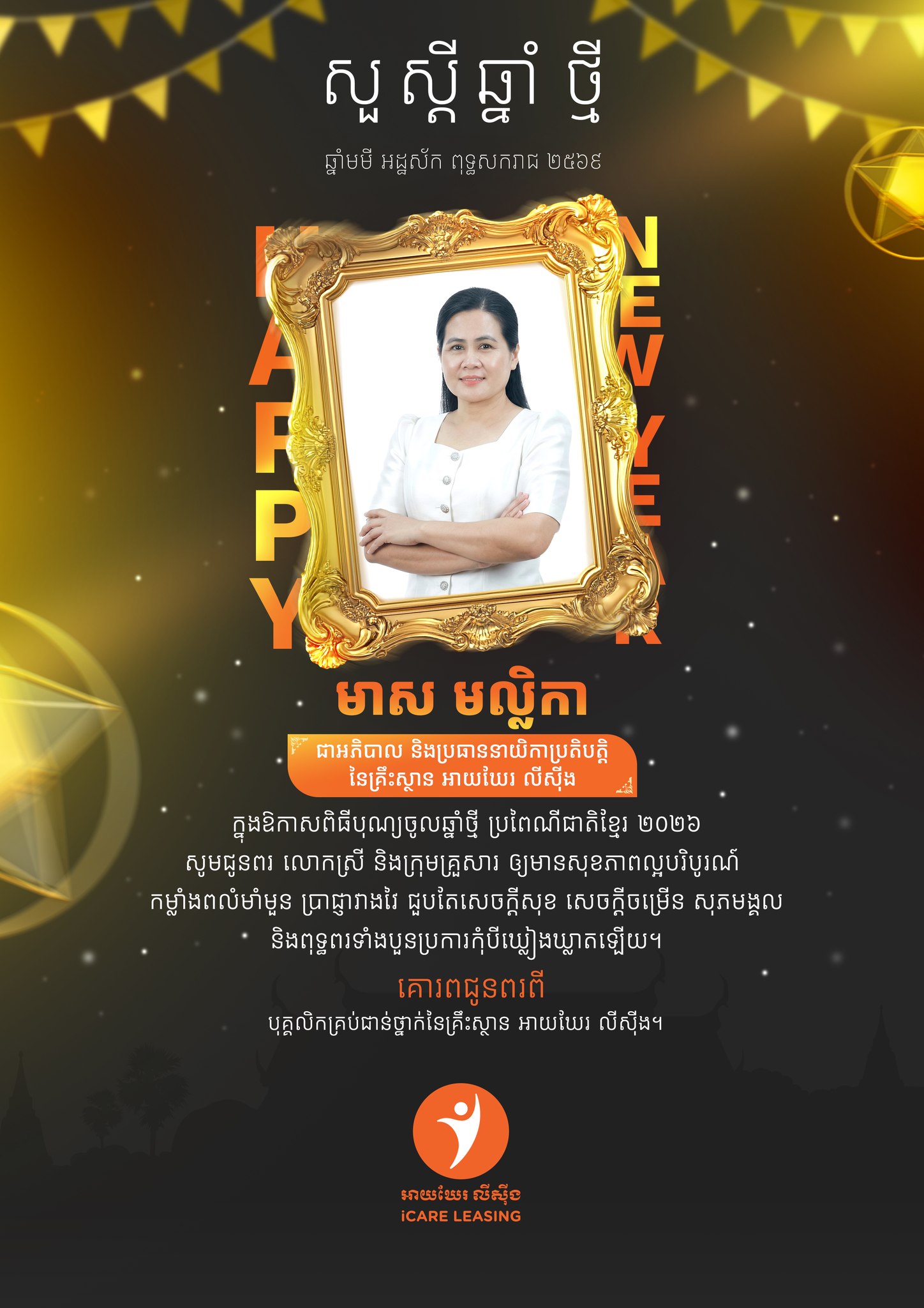 នុងឱកាសពិធីបុណ្យចូលឆ្នាំថ្មី ប្រពៃណីជាតិខ្មែរ អដ្ឋស័ក ព.ស ២៥៦៩ នេះ សូមជូនពរលោកស្រី មាស មល្លិកា ជាអភិបាល និងជាប្រធាននាយិកាប្រតិបត្តិ នៃគ្រឹះស្ថាន អាយឃែរ លីស៊ីង និងក្រុមគ្រួសារ ឲ្យមានសុខភាពល្អបរិបូរណ៍ កម្លាំងពលំមាំមួន ប្រាជ្ញាវាងវៃ ជួបតែសេចក្តីសុខ សេចក្តីចម្រើន សុភមង្គល និងពុទ្ធពរ ទាំងបួនប្រការកុំបីឃ្លៀងឃ្លាតឡើយ។ លិខិតជូនពរពី បុគ្គលិកគ្រប់ជាន់ថ្នាក់នៃគ្រឹះស្ថាន អាយឃែរ លីស៊ីង។